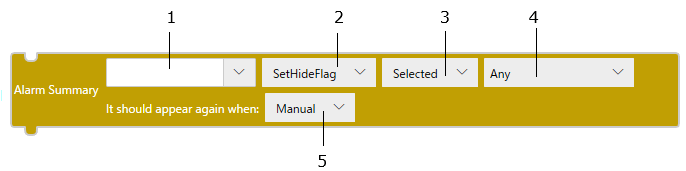 ブロック[SetHideFlag] テキストsetHideFlagForAlarmsInAlarmSummary($GraphicObject.AlarmSummary1, $Enums.SelectionType.Selected, [$Enums.AlarmState.Any], $Enums.ShowAlarmMode.Manual); |