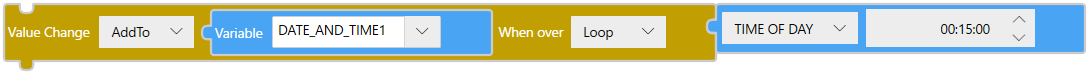 | [AddTo] | 変数 DATE_AND_TIME1 を変数ブロックに設定します。 | [TIME_OF_DAY] を選択し、定数ブロックに00:15:00を設定します。 |