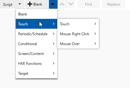When working with scripts in Text mode, the Toolchest lists triggers, operations, logic, and expressions. Double-click a trigger and a new script section is created in the script editor along with the default code for the selected trigger.