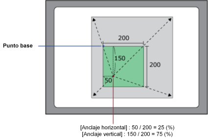 | [Anclaje horizontal] [Anclaje vertical] | Establece el punto de origen (eje X/Y) del objeto que se aumenta/reduce. En el objeto, antes de aplicar cualquier movimiento, establezca su punto base como un porcentaje desde la parte superior izquierda del objeto. Cuando [Anclaje horizontal] = 25, y [Anclaje vertical] = 75, el punto base es el que se muestra a continuación.