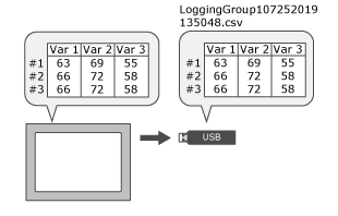 1. La primera operación de Exportar datos del registro se ejecuta después de que se registre el tercer registro, que resulta en el archivo LoggingGroup1.csv como se muestra a continuación.