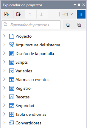 Desde el [Explorador de proyectos], navegue por las áreas del proyecto como pantallas, variables, alarmas, ajustes del destino, equipos, etc.