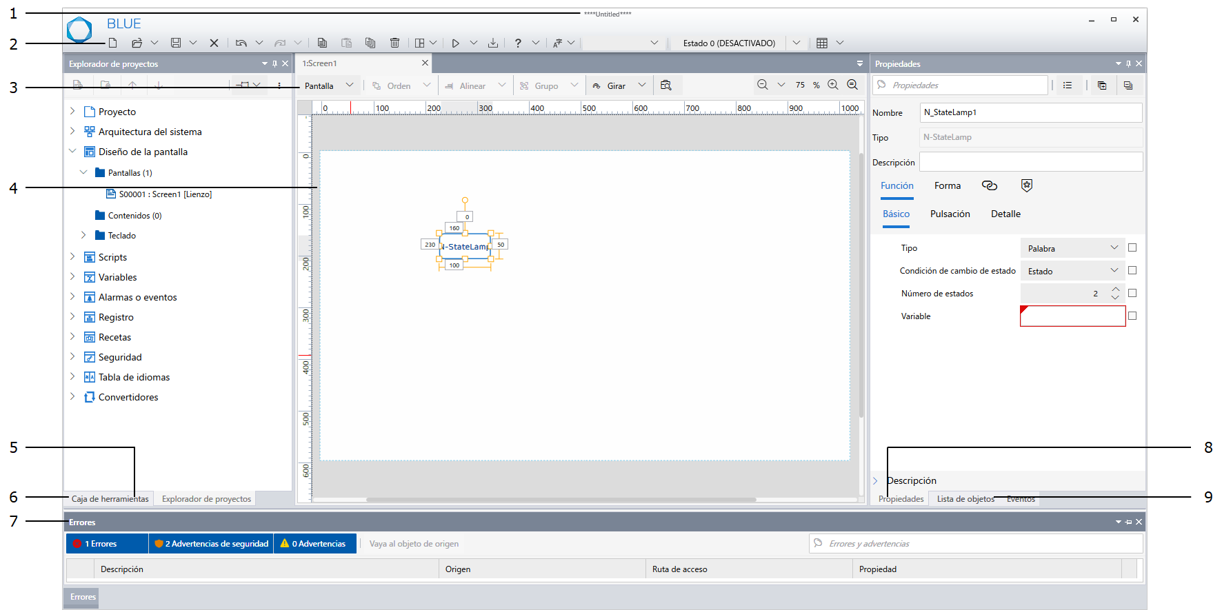 | 5 | [Explorador de proyectos] | Éste es el punto de partida para crear un proyecto. De aquí puede navegar a elementos del proyecto, como por ejemplo: pantallas, variables, alarmas, ajustes del destino, equipos, etc. |