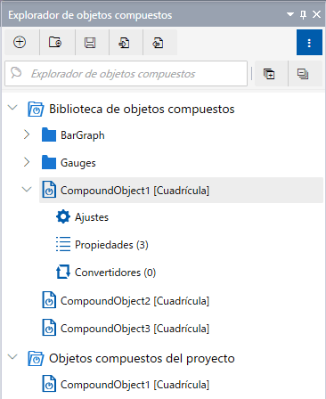Utilice el Explorador de objetos compuestos para agregar, abrir, importar o exportar objetos compuestos desde el nodo [Biblioteca de objetos compuestos] para configurar las propiedades de los objetos compuestos y otros ajustes. Cree carpetas para organizar los objetos compuestos en grupos. El Explorador de objetos compuestos muestra la Biblioteca de objetos compuestos desde la que se pueden utilizar objetos compuestos en proyectos múltiples, así como los objetos compuestos específicos d¬e cada proyecto. El nodo [Biblioteca de Objetos Compuestos] siempre está visible, ya que no depende del estado del proyecto. Los objetos compuestos relacionados en el nodo de proyecto [Objetos compuestos del proyecto] sólo son visibles si el proyecto está abierto.
