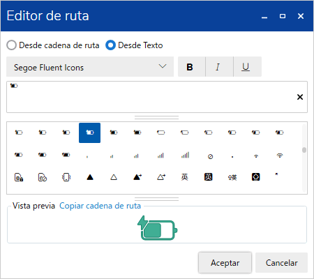 Defina cómo se diseña el objeto de ruta. Seleccione [Desde cadena de ruta] o [Desde Texto]. La cadena de ruta se borra al cambiar de [Editor de ruta] de [Desde cadena de ruta] a [Desde Texto]. Al cambiar de [Desde texto] a [Desde cadena de ruta], la cadena de ruta se construye en base al texto. |