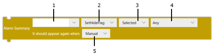 Bloque[SetHideFlag] TextosetHideFlagForAlarmsInAlarmSummary($GraphicObject.AlarmSummary1, $Enums.SelectionType.Selected, [$Enums.AlarmState.Any], $Enums.ShowAlarmMode.Manual); |