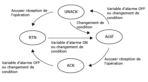 Selon le réglage de la propriété [Comportement de l'alarme], le statut de l'alarme passe de trois états ([ACQ optionnel]) à quatre états ([ACQ obligatoire]).