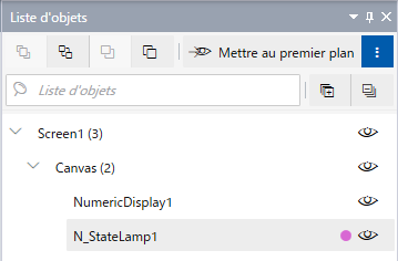 Le nombre qui apparaît après le nom indique le nombre d'objets sur l'écran/le contenu. Le nombre dans le parent inclut le nombre d'objets dans les contenus enfants. (Exemple) Grid1 (1) : Rectangle1 Canvas (4) : Rectangle1, Grid1, NumericDisplay1, Switch1 Screen1 (5) : Rectangle1, Grid1, NumericDisplay1, Switch1, Canvas Le nombre d'objets pouvant être affichés simultanément lors de l'exécution est limité. |