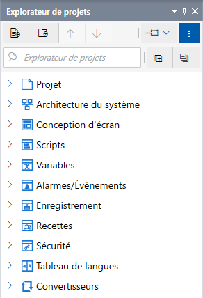 À partir de l'[Explorateur de projets], naviguez dans les zones du projet telles que les écrans, les variables, les alarmes, les paramètres cibles, l'équipement, etc.