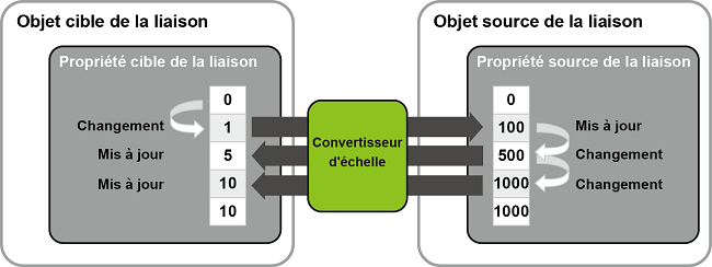 Le convertisseur vous permet de convertir la valeur de la source de liaison pour refléter la cible de liaison par n'importe quelle règle. Par exemple, si vous utilisez un convertisseur d'échelle qui convertit une valeur de source de liaison en 1/100e, si 500 est saisi dans la source de liaison, la cible de liaison reflétera 5.