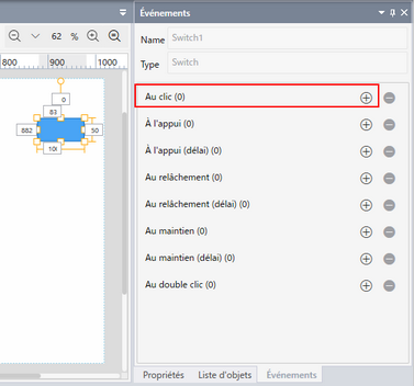 Pour créer un script qui est déclenché par un objet sur un écran, ouvrez l'écran, sélectionnez l'objet et la fenêtre [Événements] répertorie les déclencheurs disponibles pour l'objet. Cliquez sur [+] pour ajouter le déclencheur associé dans une nouvelle section de script.