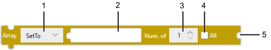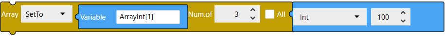 Écrit les variables de tableau spécifiées dans le bloc de variable connecté aux variables de tableau de destination. Lorsque l'option [Tout] est sélectionnée, écrit la variable, la constante ou l'expression spécifiée dans le bloc de valeur source à la variable de tableau. |
