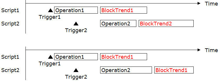 Si plusieurs déclencheurs entraînent le chevauchement des délais d'exécution des opérations [Tendance de bloc] sur différents objets de tendance de bloc, ou si les délais d'exécution des opérations [Tendance de bloc] sur le même objet de tendance de bloc ne se chevauchent pas, les dernières opérations [Tendance de bloc] sont exécutées.