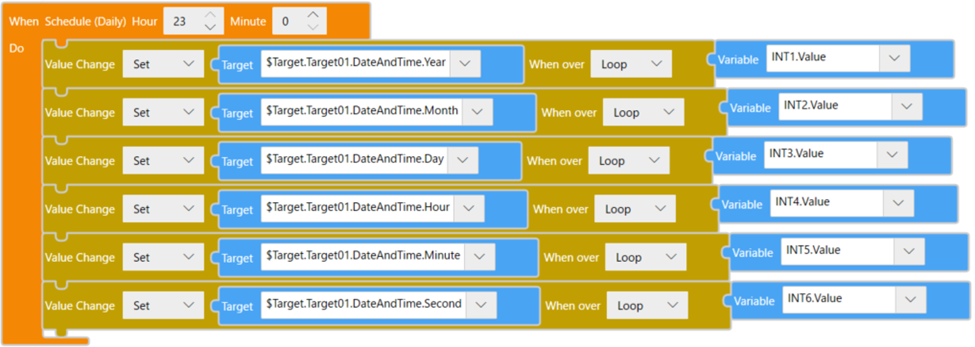 Bloc![]() TexteonScheduledDay(23, 0, () => { changeValue($Enums.WhenOver.Loop, $Enums.AssignmentOperator.Set, $Target.Target01.DateAndTime.Year, INT1.Value); changeValue($Enums.WhenOver.Loop, $Enums.AssignmentOperator.Set, $Target.Target01.DateAndTime.Month, INT2.Value); changeValue($Enums.WhenOver.Loop, $Enums.AssignmentOperator.Set, $Target.Target01.DateAndTime.Day, INT3.Value); changeValue($Enums.WhenOver.Loop, $Enums.AssignmentOperator.Set, $Target.Target01.DateAndTime.Hour, INT4.Value); changeValue($Enums.WhenOver.Loop, $Enums.AssignmentOperator.Set, $Target.Target01.DateAndTime.Minute, INT5.Value); changeValue($Enums.WhenOver.Loop, $Enums.AssignmentOperator.Set, $Target.Target01.DateAndTime.Second, INT6.Value); }); |