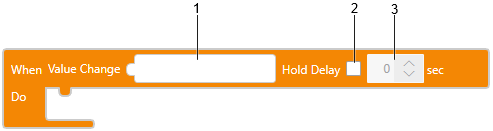 TexteonValueChange(INT1,()=>{ }); Hold Delay Après un changement de valeur et le temps spécifié s'est écoulé, l'opération est exécutée. BlocCochez la case pour définir un temps de retard. TextePour définir un délai (par exemple, 10 secondes) en mode Texte, utilisez onValueChangeWithDelay(INT1, 10, ()=>{ }); |