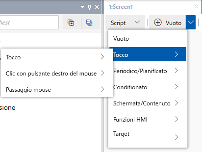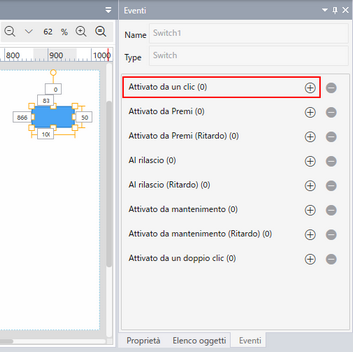 Per creare uno script che venga attivato da un oggetto sulla schermata, aprire la schermata, selezionare l'oggetto e la finestra [Eventi] elenca i trigger disponibili per l'oggetto. Cliccare su [+] per aggiungere il trigger associato nella nuova sezione di script.