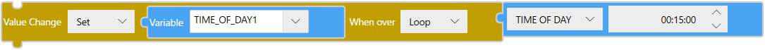 Blocco![]() TestochangeValue($Enums.WhenOver.Loop, $Enums.AssignmentOperator.Set, TIME_OF_DAY1, timeOfDay(00, 15, 00)); |