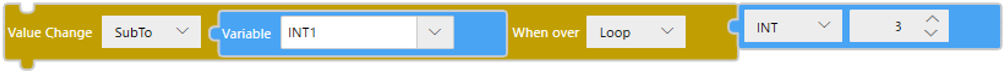 Blocco![]() TestochangeValue($Enums.WhenOver.Loop, $Enums.AssignmentOperator.SubTo, INT1, 3); |
