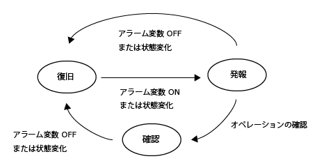 アラームステータスは [アラーム動作] プロパティの設定により状態数 3 ([任意確認]) または状態数 4 ([必須確認]) で遷移します。