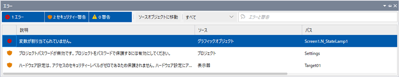 プロジェクトに安全ではない設定が含まれている場合に表示される警告メッセージです。プロジェクトにこの種類のメッセージが残っていても、プロジェクトの転送やシミュレーションの実行することはできます。ただし、安全でない設定を維持する特別な理由がない限り、この警告メッセージを解決することを推奨します。 |