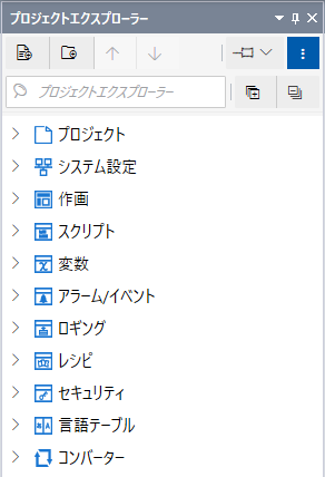 [プロジェクトエクスプローラー] から、プロジェクト内の画面、変数、アラーム、表示器設定、機器などの設定画面へ移動できます。
