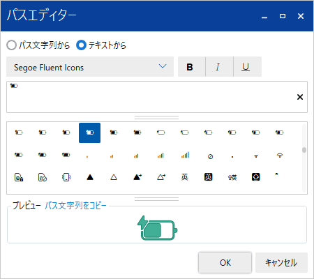 パスオブジェクトのデザイン方法を設定します。[パス文字列から] または [テキストから] を選択します。 [パスエディター] を [パス文字列から] から [テキストから] に変更すると、パス文字列は消去されます。[テキストから] から [パス文字列から] に変更すると、パス文字列はテキストに基づいて作成されます。 |