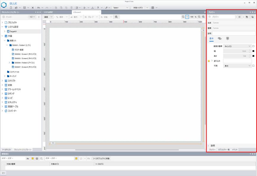 [プロジェクトエクスプローラー] で選択した項目や、画面および画面に配置したオブジェクトのプロパティを [プロパティ] で設定します。