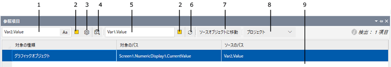 [参照項目] ウィンドウを使用して、プロジェクトまたはコンパウンドオブジェクトで指定したソースプロパティまたは文字列のインスタンスを検索できます。[参照項目] ウィンドウでソースプロパティまたは文字列の置き換えができます。
