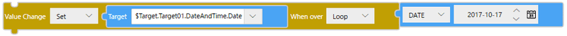 ブロック![]() テキストchangeValue($Enums.WhenOver.Loop, $Enums.AssignmentOperator.Set, $Target.Target01.DateAndTime.Date, date(2017, 10, 17)); |