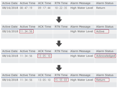 알람 상태가 표시됩니다. 활성, ACK, 복귀 및 UNACK입니다. |