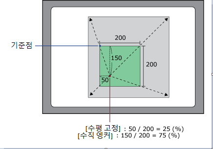 | [수평 고정] [수직 엥커] | 크기가 확대/축소된 오브젝트의 원점 (X/Y 축) 을 설정합니다. 동작이 적용되기 전의 오브젝트에서, 기준점을 오브젝트의 왼쪽 위에서의 백분율로 설정합니다. [수평 고정] = 25 및 [수직 엥커] = 75인 경우, 기준점은 아래와 같습니다.