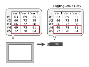 | 예 | [Export Latest Data]*1 | [Append to Existing File]*1 | [로깅 그룹] 속성 창의 [날짜 / 시간 추가] |