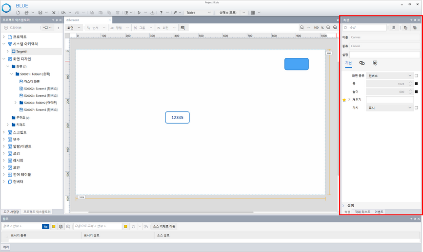 속성 창에서 [프로젝트 익스플로러] 에서 선택한 항목, 화면 및 화면에 배치된 오브젝트의 속성을 설정합니다.