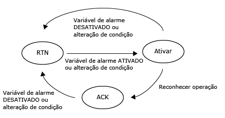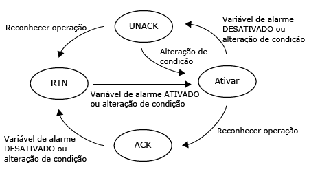 Dependendo da configuração na propriedade [Comportamento de Alarme], o status do alarme transita entre três estados ([ACK Opcional]) ou quatro estados ([ACK Obrigatório]).