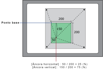 | [Âncora horizontal] [Âncora vertical] | Definir o ponto de origem (eixo X/Y) do objeto que é dimensionado para cima/para baixo. No objeto antes de qualquer movimento ser aplicado, defina o seu ponto base como uma porcentagem da parte superior esquerda do objeto. Quando [Âncora horizontal] = 25, e [Âncora vertical] = 75, o ponto base é como mostrado abaixo.