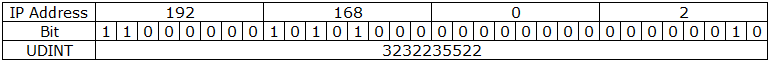 Você pode usar dados de 32 bits (Int) para alterar o valor do endereço IP. O valor do endereço IP é alterado conforme mostrado na figura abaixo. Em dados de 32 bits, cada octeto no endereço IP é salvo em unidades de 8 bits.
