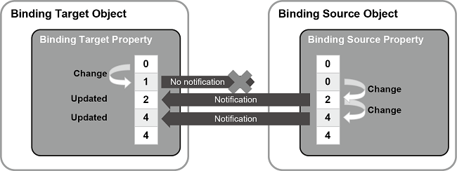 Vinculação de dados permite que você escolha a direção na qual os valores de propriedade são refletidos entre o Destino de vinculação e a Origem de vinculação.