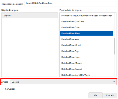 Defina a direção na janela do seletor de Propriedades onde você seleciona a Origem de vinculação.