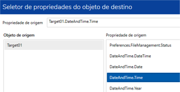 Como um exemplo de Vinculação de dados, uma propriedade de Exibição de data/hora [Valor atual] está associada a uma propriedade que contém a data/hora da unidade do display. Neste caso, a propriedade [Valor atual] é o Destino de vinculação e a propriedade que contém a data e a hora é a Origem de vinculação.