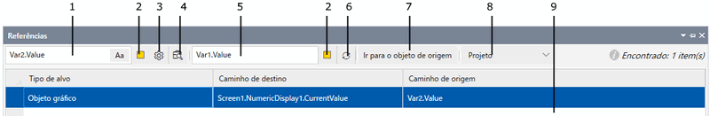 Usando a janela [Referências], você pode procurar por instâncias de uma propriedade ou texto de origem especificada no projeto ou objetos compostos. Você pode então usar a janela [Referências] para substituir a propriedade ou texto de origem.
