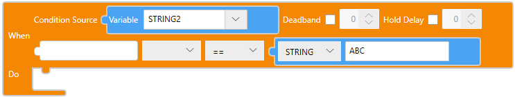 Bloco![]() TextoonCondition(STRING2 == "ABC",{enableDelay:false,enableDeadband:false,delayValue:0,deadBandValue:0}, ()=>{ }); |