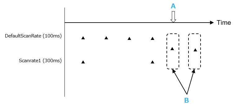 Se várias taxas de digitalização tiverem a mesma configuração, o tempo para a leitura dos valores de endereço do dispositivo de leitura das variáveis associadas é sincronizado.