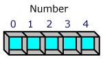Pense em uma matriz como uma linha de caixas com um número associado a cada caixa. No diagrama a seguir, a variável número da matriz contém 5 elementos 0-4. Os valores das variáveis são armazenados em cada uma das 5 caixas.