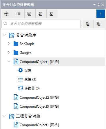 使用复合对象资源管理器从 [复合对象库] 节点添加/打开/导入/导出复合对象,配置复合对象属性和其他设置。创建文件夹将复合对象组织成组。复合对象资源管理器显示复合对象库,其中的复合对象可在多个工程中使用,同时也显示工程特定的工程复合对象。由于不取决于工程状态,[复合对象库] 节点始终可见。与工程 [工程复合对象] 节点相关的复合对象只有在工程打开时才可见。