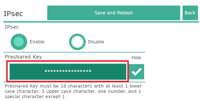 预共享密钥必须是 16 个字符,至少有 1 个小写字符、1 个大写字符、1 个数字和 1 个特殊字符 ( ~ ! @ $ % ^ & * _ + - = ` \ ( ) [ ] :“ ‘ < > { } # ;).