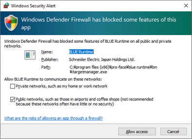 当未打开所需的以太网端口时,将显示对话框。 单击[允许访问]。 单击[允许访问]将打开所需的以太网端口。 如果您在上面的对话框中单击[取消],或由于Windows设置而没有出现以上对话框,请手动设置权限。有关权限的信息,请参阅以下内容。 |