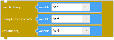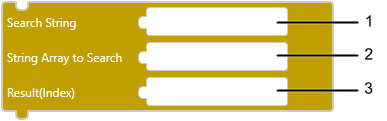 | 3 | [Result(Index)] 设置一个 INT 变量,存储与 [Search String] 完全匹配的字符串的数组元素编号。 如果有多个匹配的字符串数组元素,则存储较小的元素编号。 如果没有匹配项,则存储-1。 |
