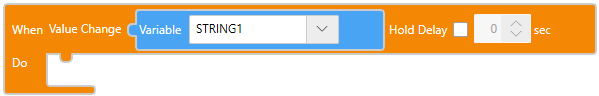文本onValueChange(STRING1,()=>{ }); Hold Delay 值更改并经过指定的时间后,运行该操作。 块选择复选框,设置一个延迟时间。 文本要在文本模式下设置一个延迟时间 (例如,10秒),请使用 onValueChangeWithDelay(STRING1, 10, ()=>{ }); |