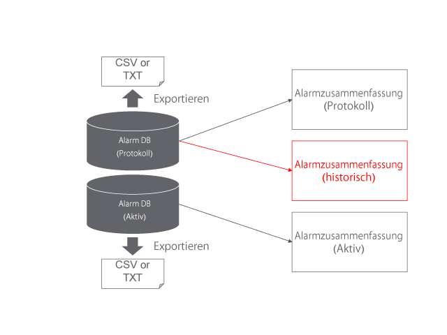Im Objekt Alarmzusammenfassung werden Alarmdaten direkt über die Alarmdatenbank (Protokoll) oder die Alarmdatenbank (aktiv) angezeigt.