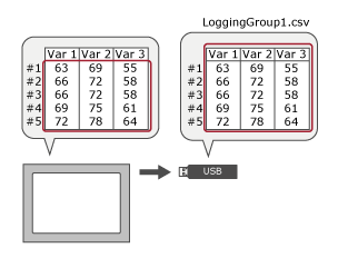 1. Der erste Protokolldatenexport-Vorgang wird nach Protokollierung des dritten Datensatzes ausgeführt, erfasst in Datei LoggingGroup1.csv gemäß unten.